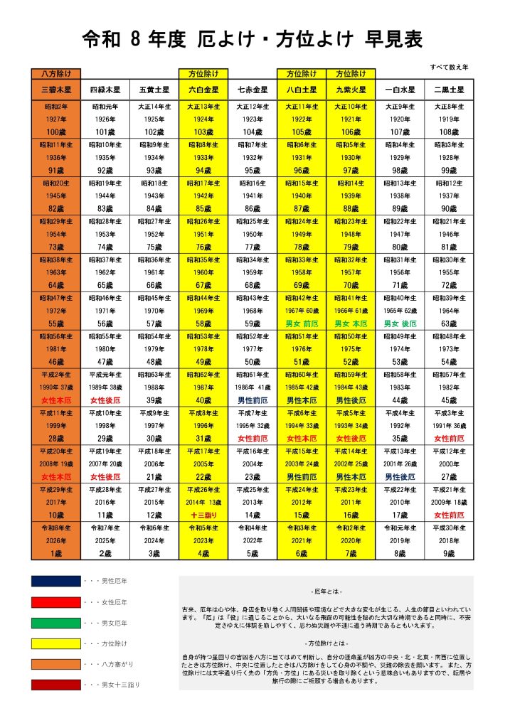 八方除けは、日柄、地相、家相、方位等からくる一切の悪事災難を取り除くご祈願です。自身が持つ運命星の星回りが中央に位置すると「八方塞がり」となります。運命星の星回りに加え、日柄、地相、家相、方位等から様々な災いを受ける年といわれます。八方塞がりの年に物事を新しく始める、あるいは今までの生活環境が変わるという場合は特に注意が必要です。